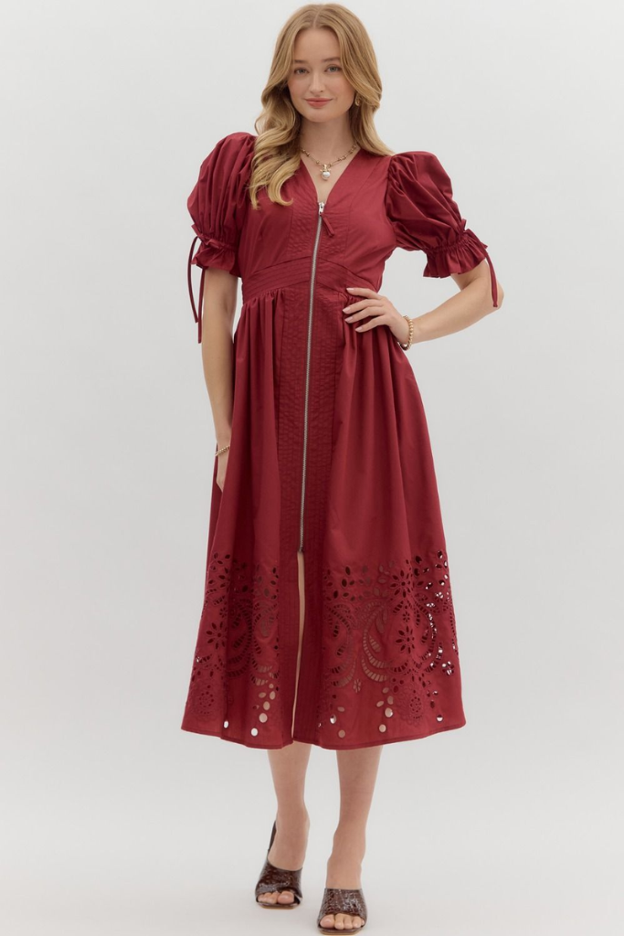 Elizabeth Crochet Trim Zip Front Midi Dress in Garnet